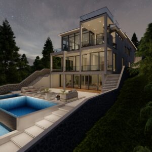 The design fuses traditional architectural elements with modern styling, incorporating open spaces that encourage flow and function. The integration of warm materials and spacious design provides a contemporary family home while respecting traditional values.