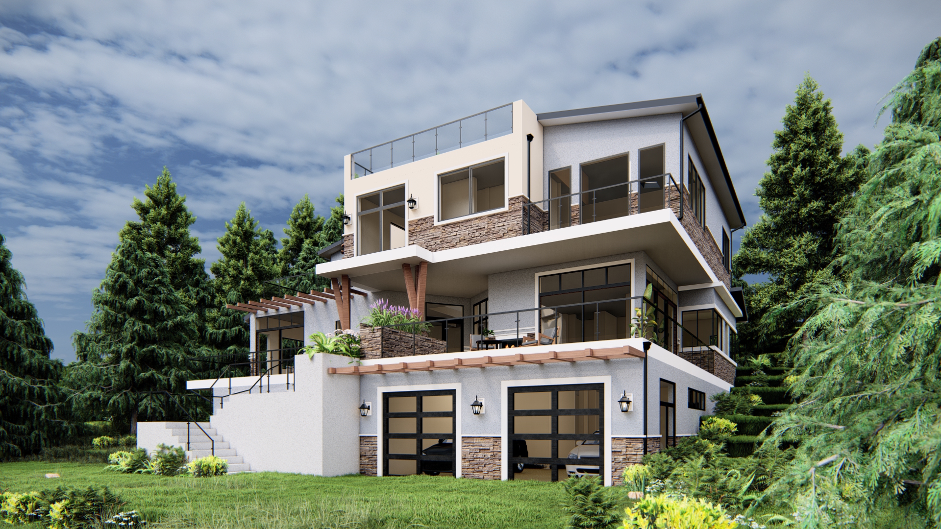 Built on an 8,550 sq.ft. lot, this 4,800 sq.ft. contemporary home celebrates a significant milestone in the clients’ lives. With 5 bedrooms, a spacious family area, and carefully balanced bright open spaces, the design includes stepped patios that overlook gardens in the front yards.
